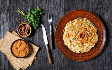 Спагетти с анчоусами и хлебной крошкой