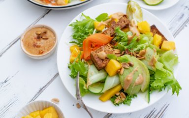 Салат с тофу, манго и авокадо — это вкусная растительная пища. Она идеально подходит для тех, кто хочет сытно и полезно поесть. Манго и авокадо придают салату пикантный вкус и кремовую текстуру.