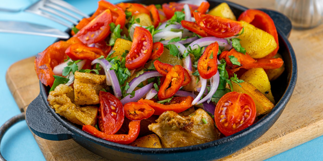 Картофель, овощи и зелень помойте, очистите лук и картошку от кожуры. Сладкий перец, картофель и телятину нарежьте соломкой, перец чили нарежьте кольцами, лук — полукольцами, петрушку и кинзу измельчите.