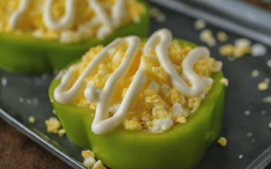 Перец, фаршированный смесью из сваренного вкрутую яйца, плавленых сырков, чеснока, майонеза и зеленого лука, — блюдо, которое идеально подходит и для повседневного использования, и как закуска к празднику.