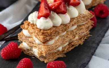 Мильфей — это французский десерт из слоеного теста с кремом, который очень часто подают с ягодами. Именно такой вариант мы хотим предложить и вам, поэтому приготовьтесь создать непревзойденный мильфей с малиной.