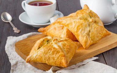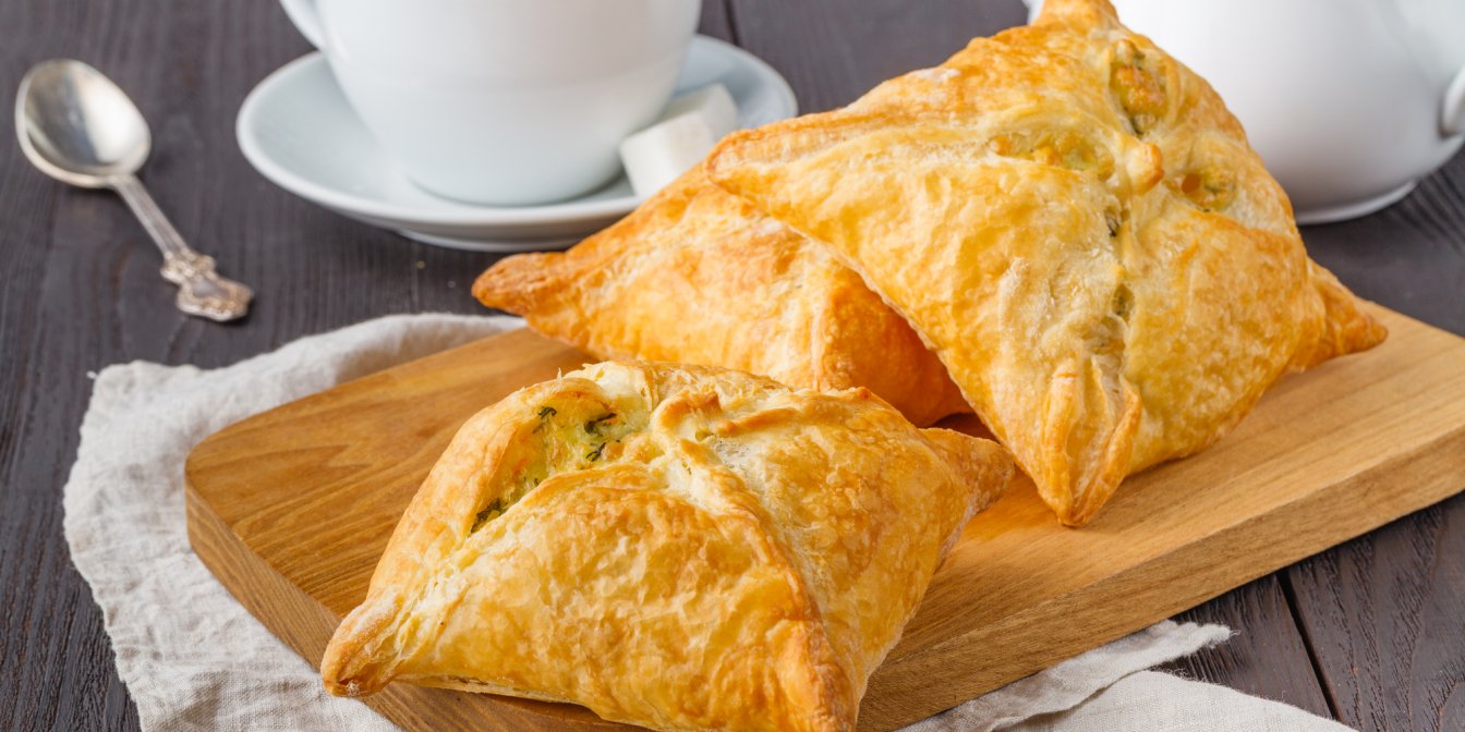 Заполните готовое слоеное тесто начинкой из сулугуни и брынзы, отправьте в духовку и подавайте к столу.