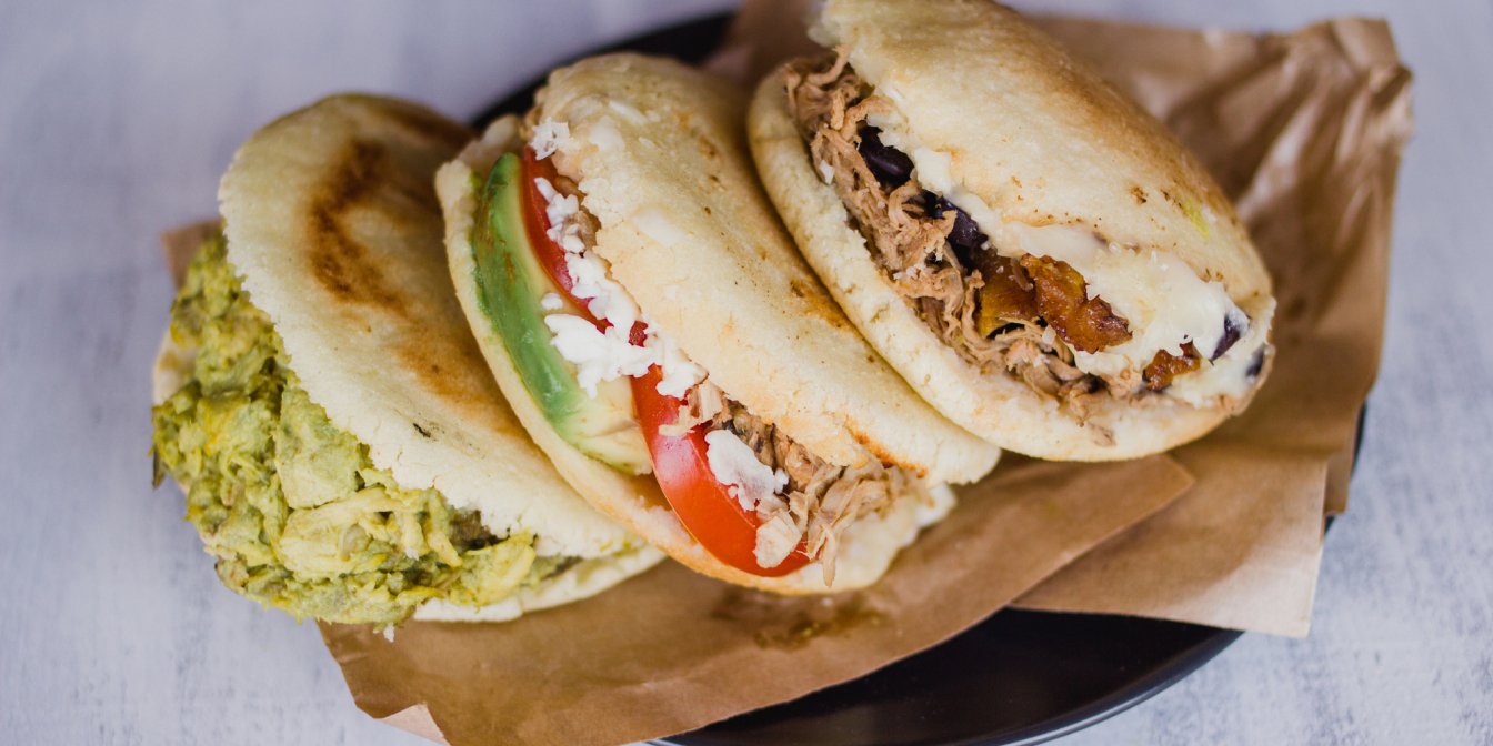 Арепы — это венесуэльские лепешки из кукурузного теста, которые наполняют начинкой. Одна из самых популярных — смесь курятины и авокадо.