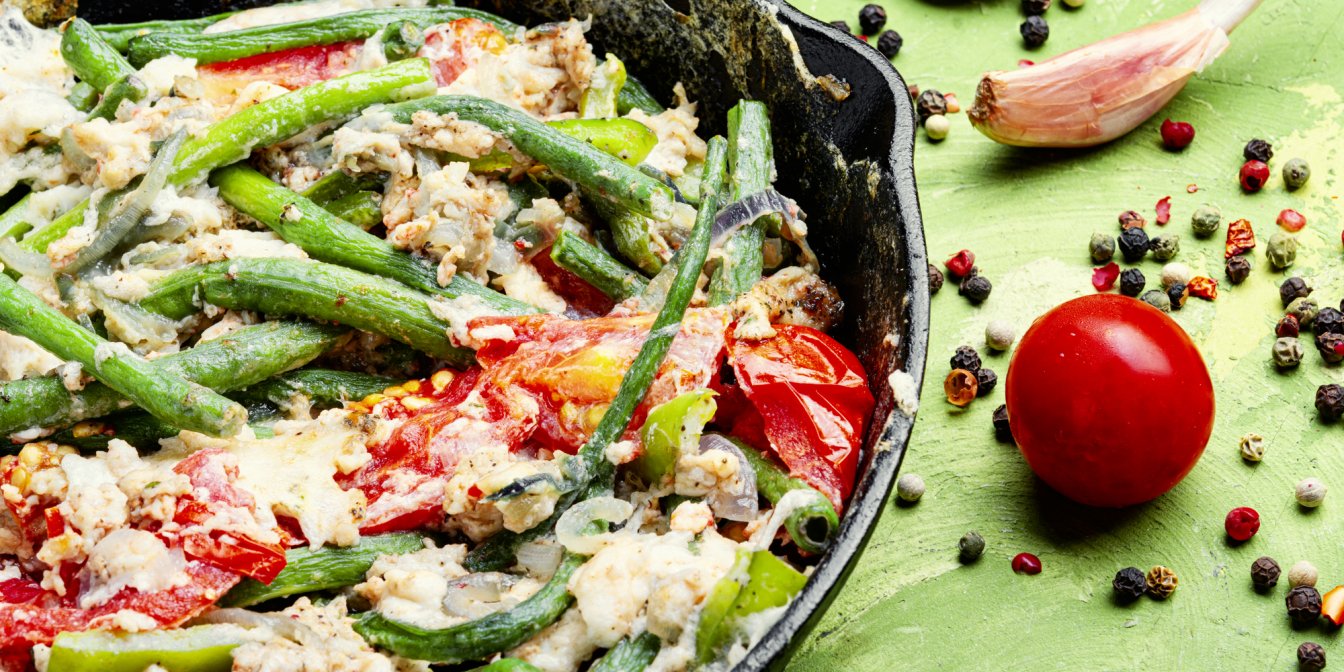 Все шаги очень просты — сначала надо бланшировать спаржевую фасоль, затем обжарить все овощи на сковороде, залить взбитыми яйцами и в конце присыпать сыром. Рассказываем пошагово: