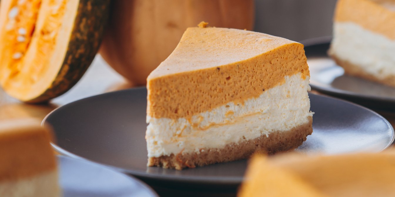 Перед подачей на стол разделите тыквенный чизкейк на порционные кусочки. По вкусу предложите топинги — отлично подойдут ореховый или карамельный топинги.