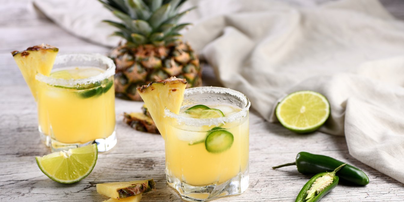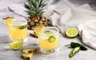 Смешайте в блендере сок ананаса, свежий сок лайма, листики мяты, кинзы, один перец халапеньо, предварительно очищенный и нарезанный кусочками.