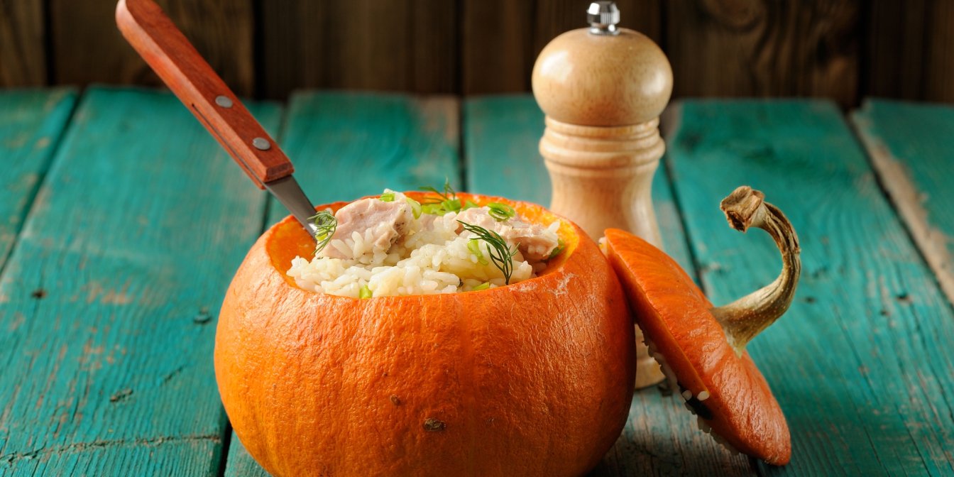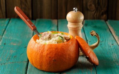 Тыкву помойте, срежьте с нее «шляпку», играющую роль крышки, осторожно очистите от мякоти, оставляя стенки примерно 3-4 см.