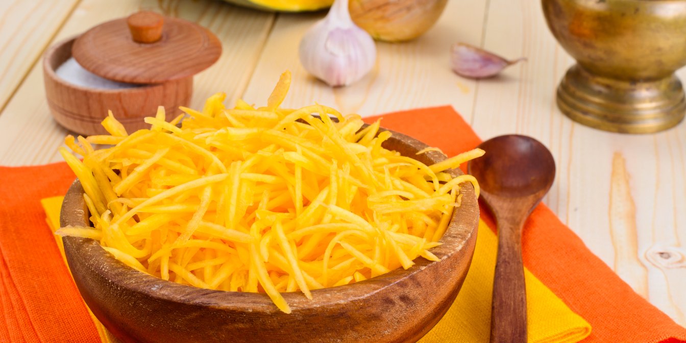 Тыкву хорошо помойте и снимите кожицу, удалите мякоть и семена. Натрите на терке для овощей по-корейски.
