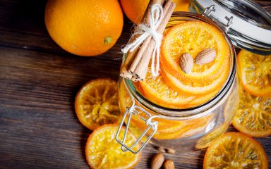 Шумовкой извлеките апельсиновые кружочки и переложите на дуршлаг, чтобы стекла лишняя жидкость. А затем положите на решетку или противень и подсушите в разогретой до 100 градусов духовке 15-20 минут. Достаньте и остудите.