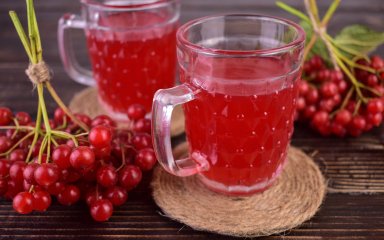 Полностью остывший отвар процедите и добавьте к соку (пюре) калины, оставшейся после перетирания. Размешайте и разлейте по стаканам. Приятного аппетита!
