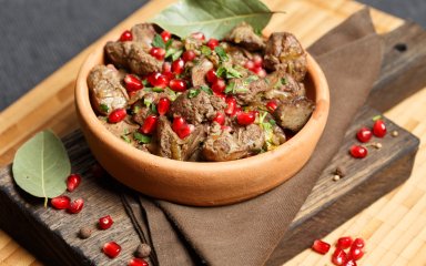 Поскольку осень — это сезон гранатов, то рецепт будет особенно уместным. Если вы любите печень и этой кисло-сладкий вкус красной ягоды, то это блюдо для вас.