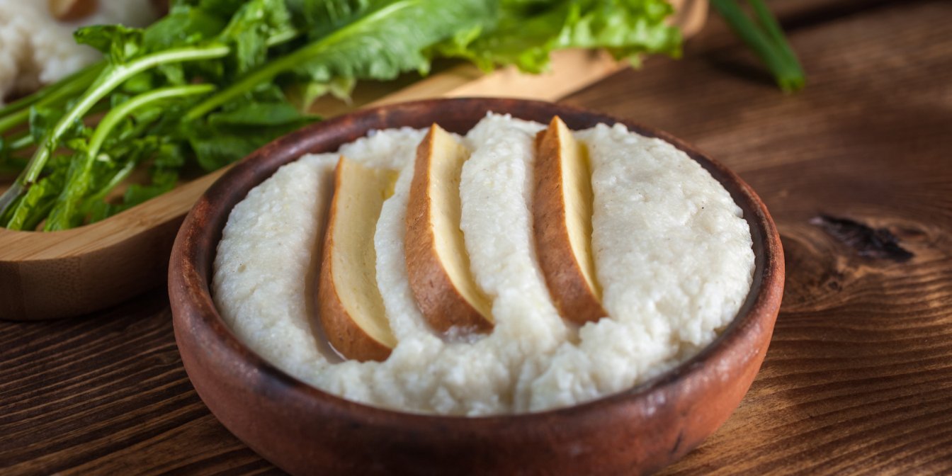 Затем всыпьте муку и, постоянно помешивая, готовьте, пока каша не загустеет. Это займет около получаса.