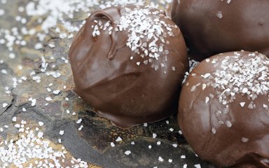 Окуните трюфели в шоколадную глазурь и разложите на тарелке. Посыпьте каждое изделие морской солью и дайте им затвердеть.