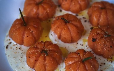 Эдуард Насыров предлагает сделать их тыквенными. И, как видно на фото, в виде этого овоща. Эти симпатичные «тыквы» подаются с вкусным соусом на основе сливочного масла, сливок и сыра.