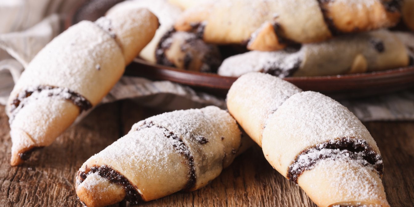 Ругелах — это мучные изделия в форме полумесяца, приготовленные из шелковистого теста из сливочного масла, муки и сливочного сыра, мягко окутывающего начинку.