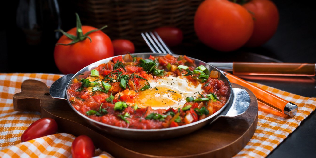 Шакшука — это яичница с овощами, но не совсем простая! Яйца жарятся в соусе из помидоров, лука, болгарского перца и специй, а едят яичницу прямо из сковороды с помощью хлеба, которым подбирают остатки овощного соуса. Где родилась ароматная шакшука и что означает ее название — читайте во вкусном рецепте!