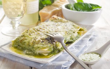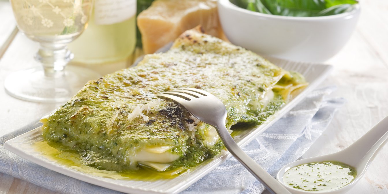 Лазанья с песто, известная также как лазанья алла портофино, создана для воскресного обеда или подачи на стол по особому случаю.
