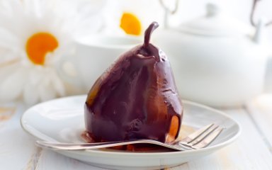 Для этого десерта груши готовят в сахарном сиропе со вкусом корицы и поливают соусом из темного шоколада. Вы можете оставить минималистичную подачу или украсить фрукты цукатами, миндальными хлопьями, измельченными орешками и т.д.