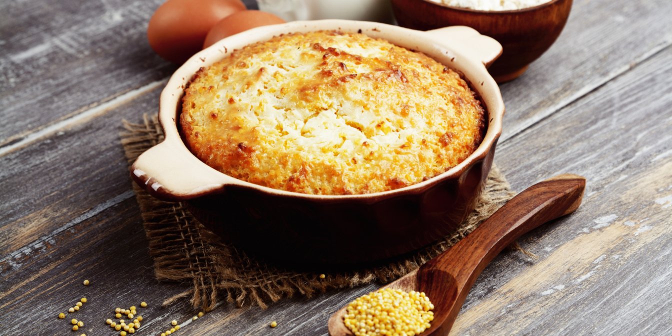 Пшено — это злаковая культура со многими питательными свойствами, не содержащая глютена, а также богатая витаминами А, группы В, Е, РР, D. Возможно, у вас нет желания есть пшено просто так, даже ради здоровья, а вот в виде пирога — с удовольствием. Мелкие хрустящие крупинки, обогащенные тягучей смесью брынзы и сыра, сведут с ума кого угодно.