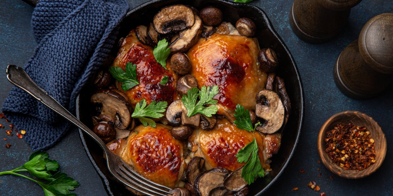 Куриные бедра с грибами и луком-шалотом — быстрый ужин в духовке
