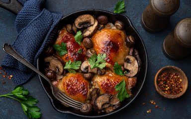 Куриные бедра с грибами — это быстро и вкусно. Румяное мясо подается с грибами, луком-шалотом и эстрагоновым соусом.