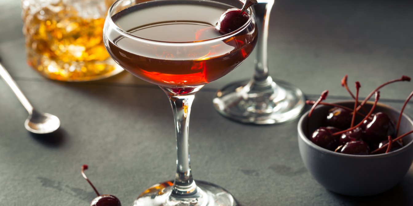 Процедите в охлажденный коктейльный бокал и украсьте коктейльной вишней на шпажке.