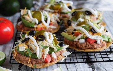 Известные мексиканские тостады, возможно, не самые красивые блюда и немного беспорядочные, но очень вкусные! Только представьте: хрустящая кукурузная тортилья, питательная начинка из фасоли, авокадо, тертого сыра и томатов. Все это приправлено пикантной сальсой.