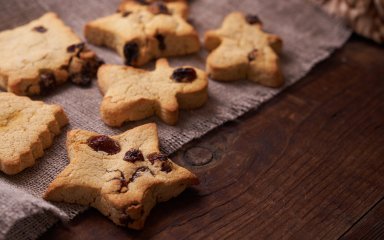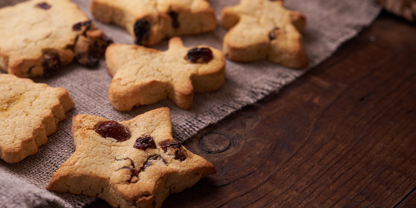 Нарежьте печенье разными фигурками, специальными выемками или кружочками стаканом. Заготовки разместите на смазанном маслом противне, на середину каждого положите изюм и запеките в духовке при температуре 170-180°C 30-35 минут.
