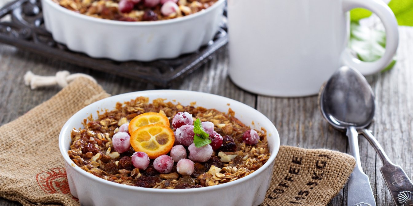 Теплая и уютная, эта утренняя запеченная овсянка — лучшее начало дня. Ее готовят с тертой морковью и яблоком, двумя видами овсянки (плющеная и хлопьями) для дополнительной порции клетчатки и подслащивают свежим апельсиновым соком, изюмом и небольшим количеством кленового сиропа вместо рафинированного сахара.