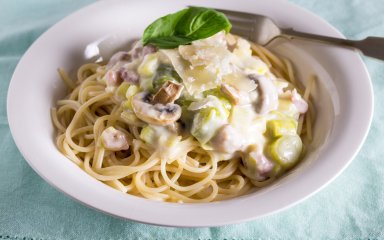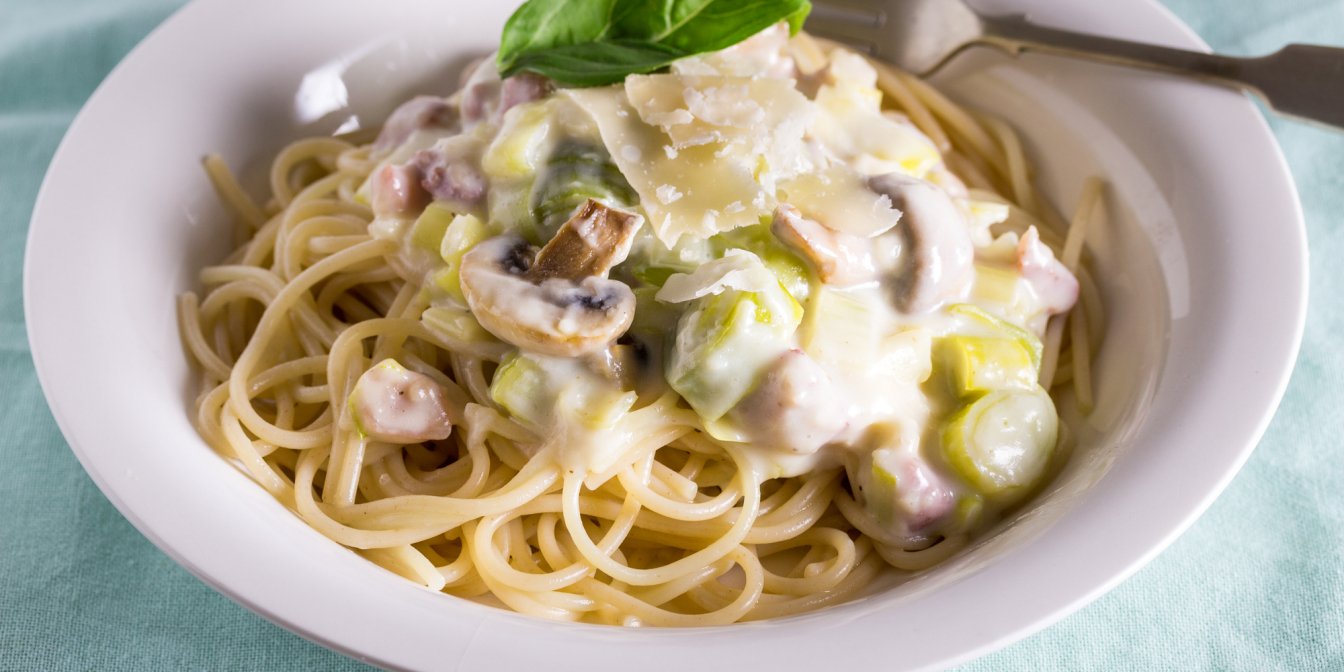 Паста — это универсальное блюдо, когда нужно получить что-то вкусное и быстро. Этот рецепт не исключение — на приготовление спагетти с ветчиной, луком-пореем и грибами понадобится всего 30 минут, а вкус у блюда просто непревзойденный!
