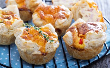Миниатюрные закуски из слоеного теста, рикотты и ветчины трудно пропустить на фуршетном столе — они привлекательны и вкусны. Кстати, эти хрустящие корзинки можно наполнять любыми начинками: от соленых, таких как колбасные изделия, сыры и овощи, до сладких, например джема, заварного крема, фруктов и ягод и т. д.