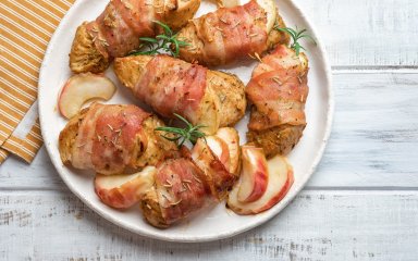 Подавайте индейку в беконе со свежим салатом и гарниром из золотистого запеченного картофеля. На тарелках ничего не останется!