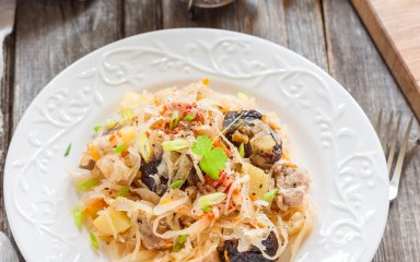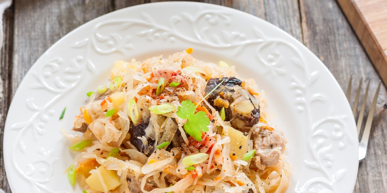 Этот сытный и вкусный гарнир, приготовленный из квашеной капусты, лука, фасоли, чернослива, тмина и специй, может сопровождать другие постные блюда — вареный картофель, вареники, грибной подливку и т.д.