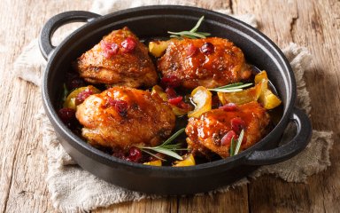 Мы предлагаем готовить окорочка со вкусной смесью из копченой грудинки, яблок, лука, горчицы и сливок.