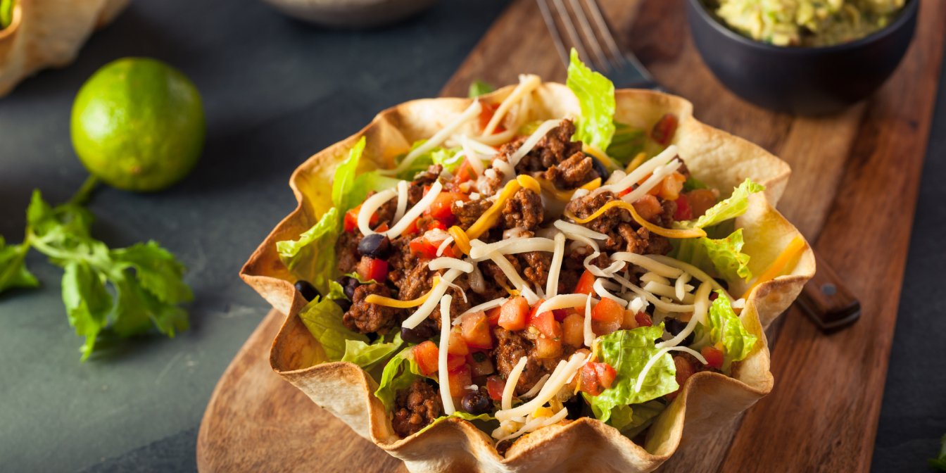 Подрумяненный говяжий фарш, салат айсберг, помидоры, сыр и маринованные огурцы с луком — звучит аппетитно. Этот салат готовится достаточно легко, а главное — быстро!