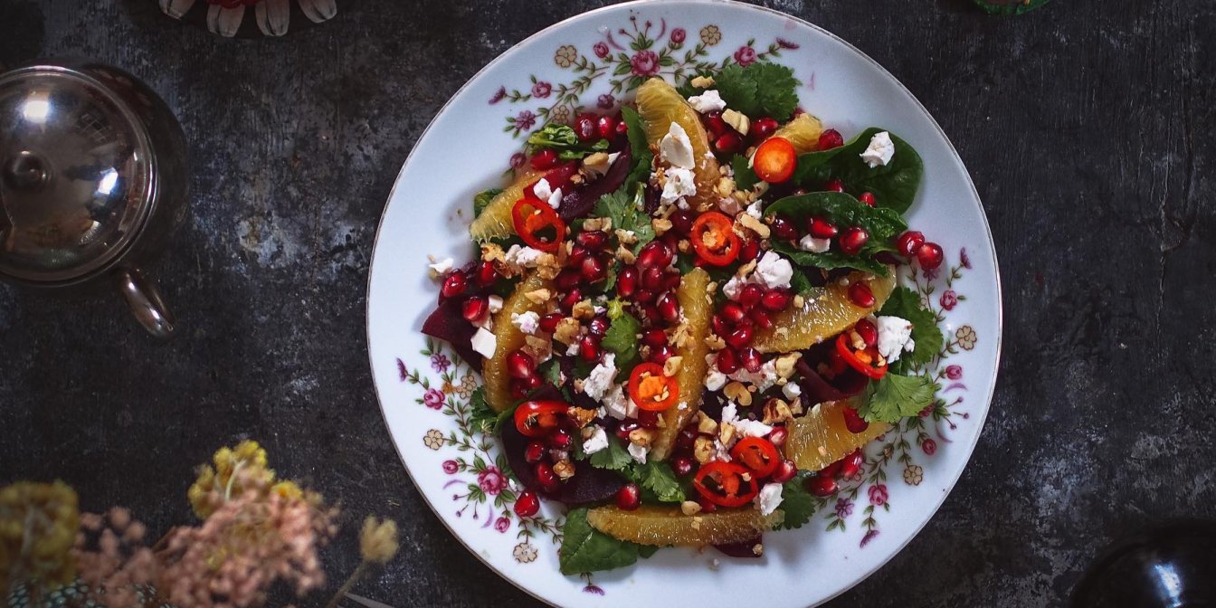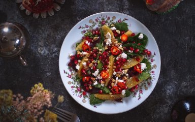 Судя по ингредиентам, блюдо еще и полезно благодаря апельсину и гранату. Как понятно по фото, в салате есть свекла. Запечь ее нужно в фольге заранее.