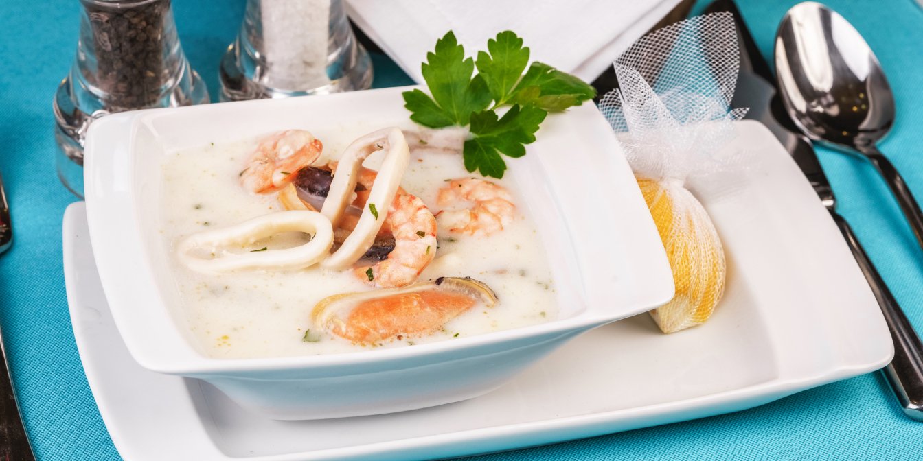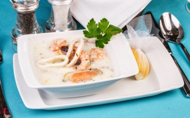 Изысканный, простой и горячий, нежный и сливочный. Словно шелк, только съедобный — сырный суп с морепродуктами подойдет для обеда. Подавайте его с сухариками и зеленью.