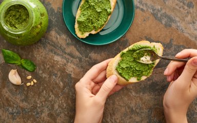 В магазине читайте состав песто на банке. Чем короче список, тем меньше там консервантов и разных добавок. Классический песто дженовезе состоит из базилика, оливкового масла, пармезана, орешков пинии, чеснока и соли.
