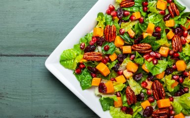 Теплый салат с овощами, клюквой и орешками