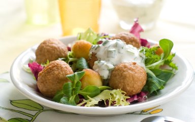 В глубокий салатник положите листья салата, сверху выложите яблоки, тефтельки и половинки яиц. Полейте заправкой и подавайте!