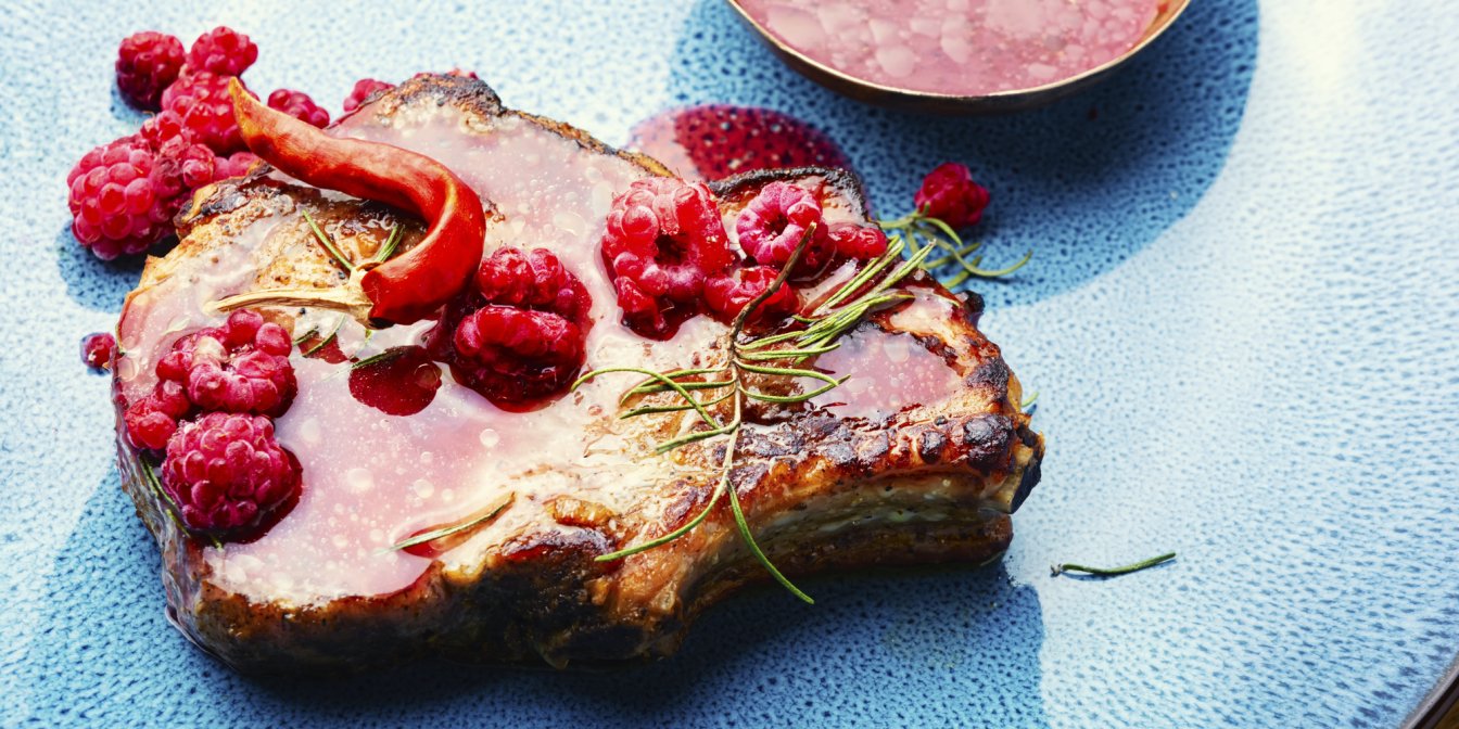 Когда ужин только на двоих, почему бы не приготовить телячьи отбивные под малиновым соусом? Все, что вам нужно — это обжарить стейки на сковороде и приготовить соус из малины и сливок.