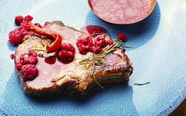 Положите отбивные в тарелки, полейте малиновым соусом, украсьте ягодами и сразу же подавайте к столу.
