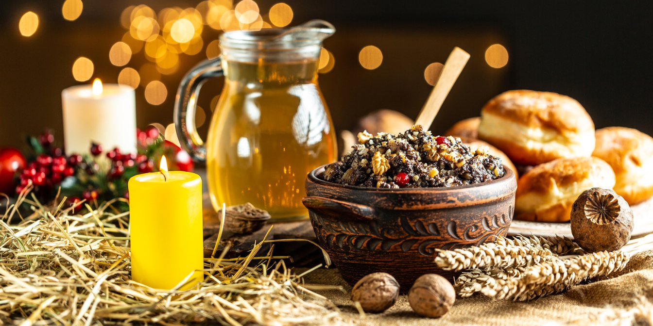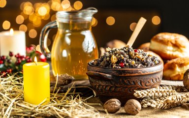 На столе обязательно должна быть богатая кутья с орехами, сухофруктами, медом, цукатами и другими ингредиентами по желанию.