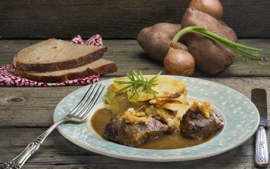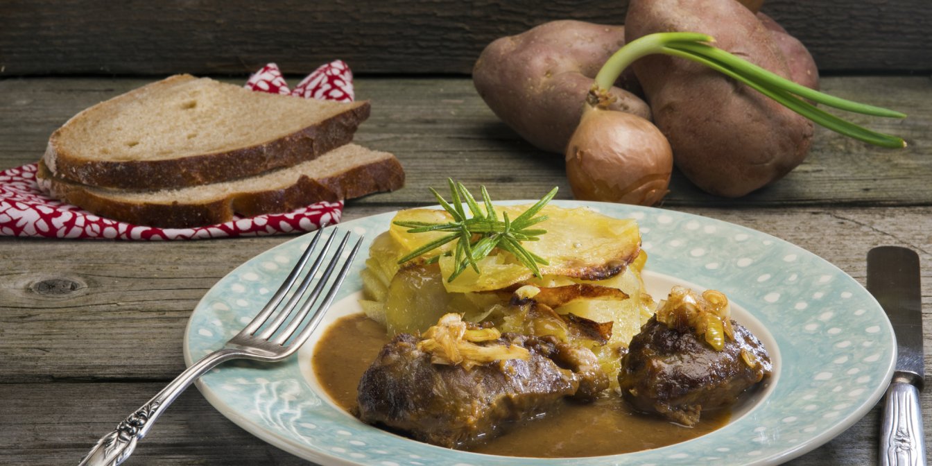 Мы готовили подрумяненную в сковороде свиную щеку в духовке около трех часов. Это щадящее и долгое запекание при средней температуре помогает мясу остаться сочным внутри. Подавайте свиную щеку с картофельным гратеном.