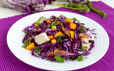 Сегодня у нас вегетарианское блюдо — салат из красной капусты и сейтана. Но мясоеды тоже будут не прочь попробовать эту диковинку.