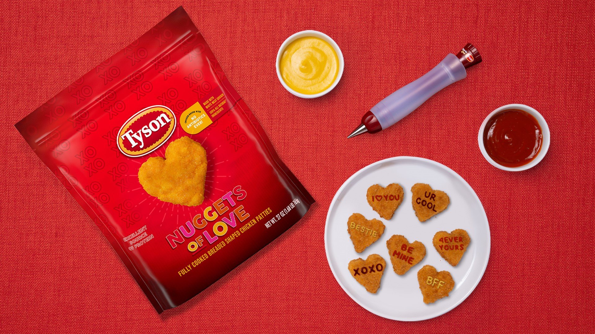 Кроме того, в подарочном пакете будет специальная ручка. Ее можно наполнить любимым соусом и написать на наггетсах-сердечках пожелания или любовные послания.