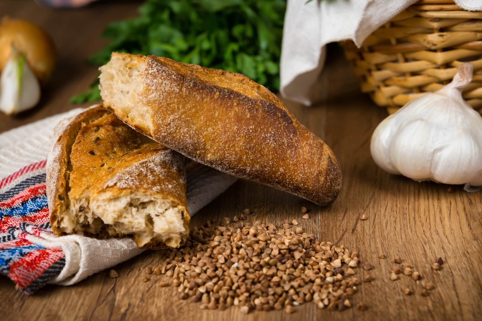 Багет принято не резать ножом, а рвать. Конечно, если нужно сделать бутерброд, лучше все же воспользоваться ножом. А бутерброды с гречневым багетом получаются просто невероятные! Особенно советуем бутерброды с чесночным маслом с зеленью.