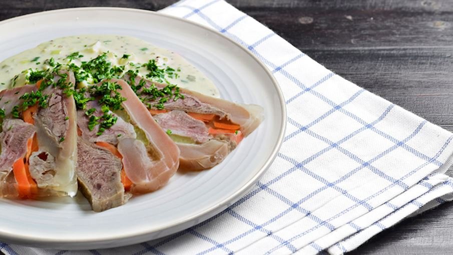 Это французское блюдо состоит из телячьей головы, которую долго варят, пока мясо не станет нежным, а кожа не приобретет желеобразную консистенцию.