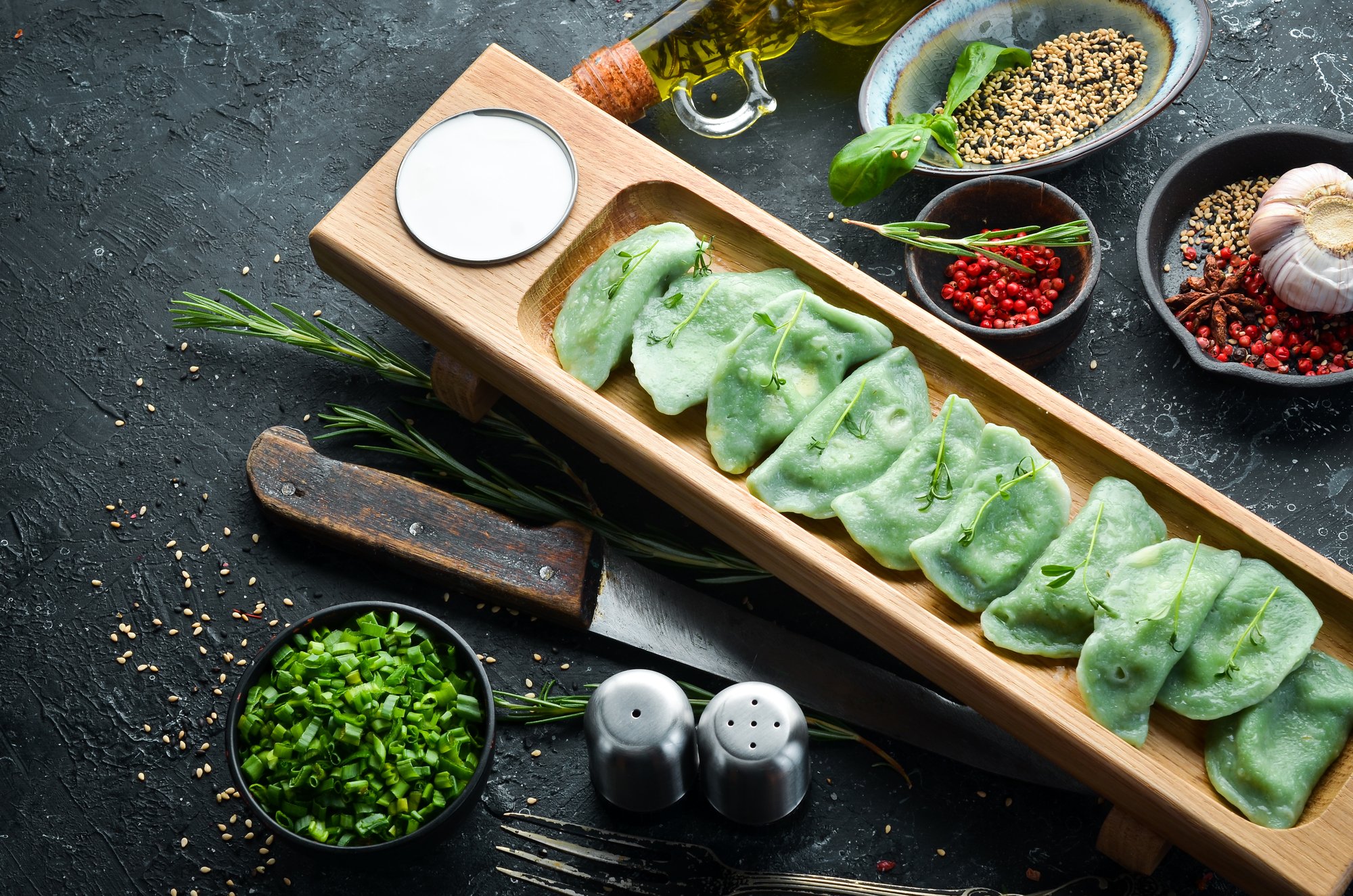 Шпинат в этом рецепте используется и для приготовления начинки, и для приготовления теста. Сок шпината придаст ему чудесный зеленый цвет. Что касается начинки, то смешайте его с брынзой. Насыщенный солоновато-масляный вкус ни с чем не сравнить, поэтому подавайте со сметаной.