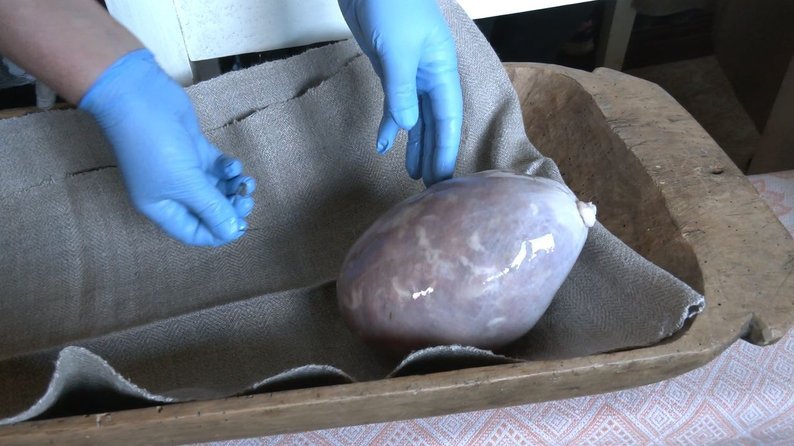 Когда фарш хорошо перемешан со специями, им начиняют свиной мочеиспускательный канал, который перед этим замачивается в ботве картофеля. Крахмал хорошо вытягивает все неприятные запахи из мочевого пузыря. Затем карух завязывают льняной нитью, подвешивают под крышей, где он сушится от трех до пяти месяцев.